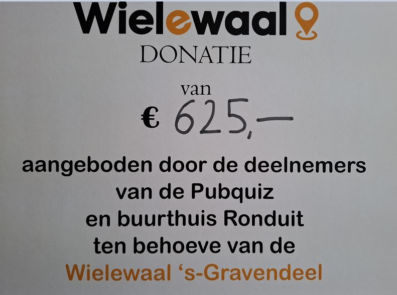 Op 27 maart 2026 was de Wielewaal ‘s-Gravendeel de begunstigde. Na afloop van de Pubquiz werd een donatie ontvangen ad € 625,00, aangeboden door de deelnemers van de Pubquiz en het Buurthuis Ronduit.